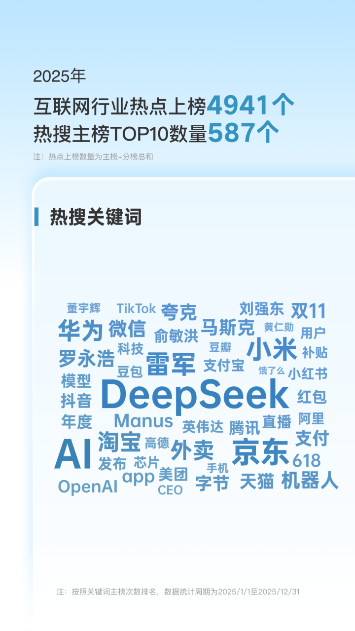 此外,科技与AI成为年度最亮眼的增长点。AI波浪全年上榜723次。DeepSeek在词频统计中呈现断层提高上风,联袂AI、东说念主形机器东说念主、Manus等关键词紧随后来,记号着前沿科技已从实验室看法雅致步入巨匠视线。在数码汽车规模,小米SU7登顶年度汽车事件kaiyun sports,苹果与华为则接续领跑手机行业热度。