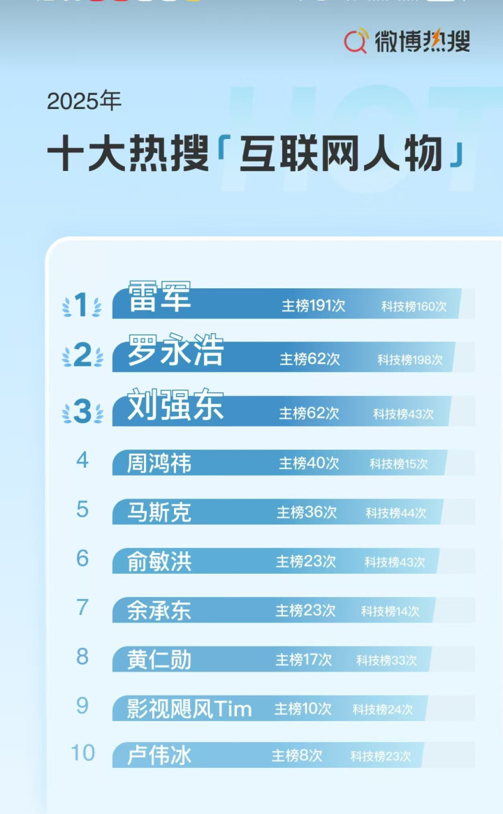 上证报中国证券网讯(记者刘暄)微博2月11日发布《2025年微博热搜趋势阐发》。阐发基于微博热搜话题和用户作为数据,全景式归附了以前一年巨匠关爱的社会、文娱及垂直规模焦点。其中,在十大热搜“互联网东说念主物”里,雷军、罗永浩、刘强东位列前三。