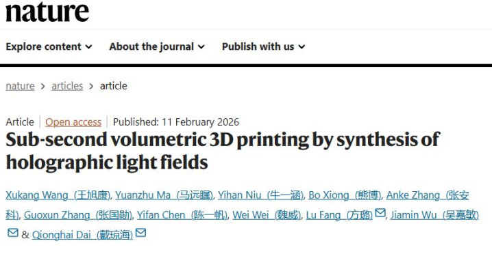 关联论文以《基于全息光场面成的亚秒级体积三维打印》(Sub-second Volumetric 3D Printing by Synthesis of Holographic Light Fields)为题发表在 Nature[1]。清华大学成像与智能时间本质室的戴琼海院士、吴嘉敏副考验和电子系方璐考验担任共同通信作家,博士后王旭康、博士后马高见和博士生牛一涵是共归拢作。