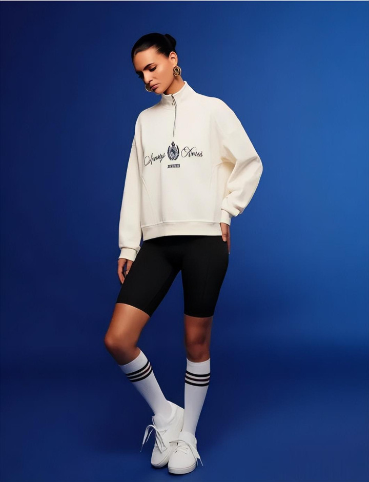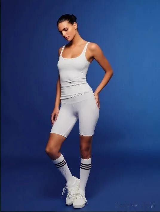 模特穿上图1衣饰,版型宽松。搭配玄色、材质为氨纶、纯色、紧身、长度至大腿中部的骑行短裤,再搭配金色圆环耳饰。