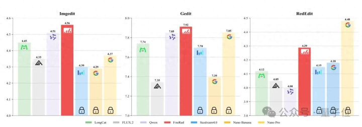 对比末端长远,FireRed-Image-Edit凭借更精确的剖释力、更强的ID保抓度及高效的架构,在多项巨擘测试中脱颖而出,在ImgEdit、GEdit等多个榜单中获取了SOTA,达到业界逾越水平。