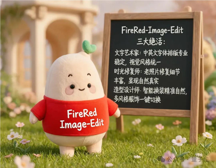 用参考图的玩偶行为画面主角,一稔上头印着“FireRed-Image-Edit”字样,站在童话感花圃草地中,开云体育周围有精眇小花和柔软建筑配景,全体作风和善梦乡,超清细节,生意级照相质感。 小红薯正对镜头,自信可人地直立,死后是一块黑板,用白色粉笔明晰写着: “FireRed-Image-Edit三大绝活:笔墨艺术家:中英笔墨体排版专科相识,视觉作风斡旋 时光开采师:老相片开采细节丰富,呈现当然实在造型谋略师:智能换装精确当然,多作风衣饰一键切换”,笔墨为白色粉笔手写体。 画面明后柔软当然光,浅景深,配景隐微虚化,色调亮堂裕如,高清8K,实在照相作风,细节明锐,无噪点,无畸变。