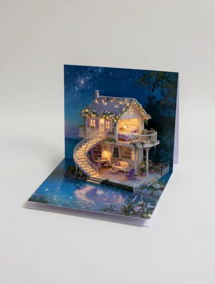 谋略一张A6折叠卡:翻开时长远图片中的小屋。