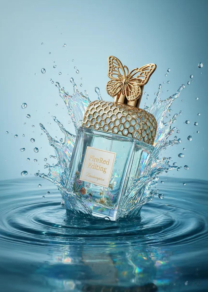 一瓶香水放居中,香水瓶放在水面上,透明方形瓶身搭配金色金属瓶盖,极简而当代。彻亮的水花如爆炸般环绕瓶身通达开,大量水点在空中定格,折射出梦乡的光彩。底部水波激荡层层扩散,与飞溅的水花酿成动静交汇的视觉张力。寒冷活力与高端蹧跶并存,仿佛将夏令清泉的转眼灵动历久封存。透过瓶身能看到香水背后的诠释书。
