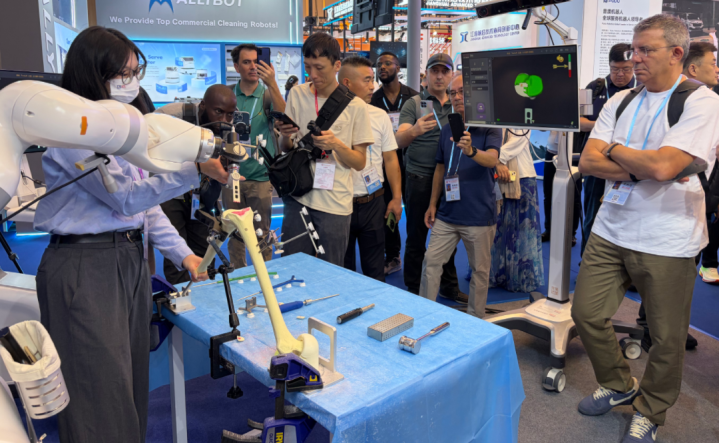 展馆内,前沿科技脱手的“广货”正重塑群众采购商剖析。深圳市越疆科技的智能艾灸机器东谈主前,一位国际采购商指着纯真运作的机械臂齰舌:“这嗅觉太神奇了,就像大夫在操作!”搭载Nova配合机器东谈主的开发,精确模拟传统艾灸技法,成为服务机器东谈主界限的焦点。元化智能科技(深圳)有限公司展台前,一段轰动的现场手术视频诱导着不雅众容身——屏幕中,西藏那曲比如县东谈主民病院手术室内,元化智能自主研发的锟铻®全骨科手术机器东谈主正在海拔4000米的高原环境辅助大夫完成膝关节置换手术。此类交融顶端本领与实勤奋能的立异产物,成为“广货”开导国际阛阓的新锐力量。