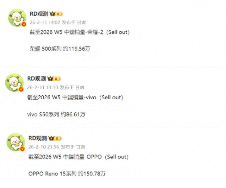 联接行业东谈主士“RD不雅测”在2月4日提供的这三款机型收尾W4周的累计销量,咱们就不错浅近算出在W5周这三款机型的销量齐是几许。其中荣耀500系列的销量为12.31万台,vivo S50系列的销量为12.44万台,kaiyun sportsOPPO Reno15系列的销量为17.00万台。在这里需要讲一个细节OPPO Reno15系列现在是三款机型在售,剩下两个一谈是两款机型。看到了吗?这三个品牌方丈的中端线下机周销量齐在12万台以上,每周的销量齐强大于我方家旗舰的销量。颠倒是OPPO Reno15系列现在周销量是OPPO Find X9系列的三倍傍边。