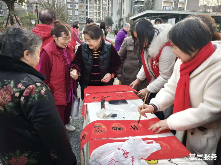 住户们在志愿者的指示下现场挥毫泼墨,将环保理念与新春祝贺融入对子福字。