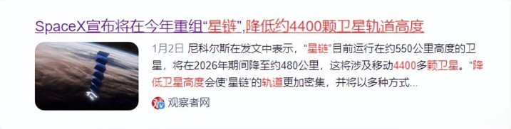 SpaceX就在2026年开年给天下整了个大活儿:告示要把4400多颗“星链”卫星的轨谈高度,从550公里硬生生降到480公里。