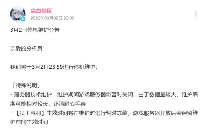 3月2日晚,火爆一时的二次元射击游戏《尘白禁区》突发公告,告示于当日23:59初始停机融合,仅以“办事器时间融合、数据量繁密”为由邋遢评释,未明确任何开服时候,一时候激励游戏圈暖热。