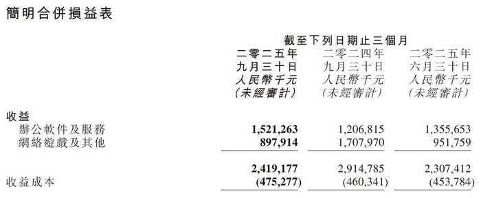 从业务结构来看,金山软件早已变成“办公业务独扛大旗”的姿色。2025年第三季度财报自满,公司举座营收24.2亿元,同比下降17%;净利润2.13亿元,同比暴减48%,中枢分化在于两伟业务的“冰火两重天”:办公软件及管奇迹务(主要由金山办公孝敬)营收15.21亿元,同比增长26%,成为集团最踏实的现款牛与增长引擎;而荟萃游戏偏执他业务营收仅8.97亿元,同比下降47%,占比进一步萎缩,成为影响集团功绩的主要要素。