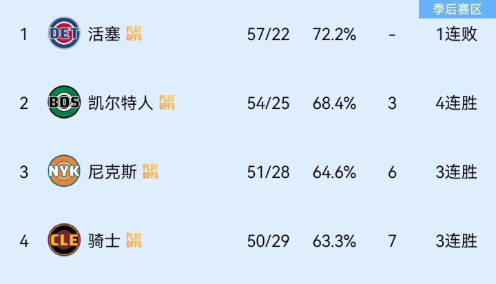 至此,NBA东部透澈阑珊,仅活塞锁东部第1!骑士锁首轮主场,丛林狼无缘前4 ,东部5-10大乱斗: