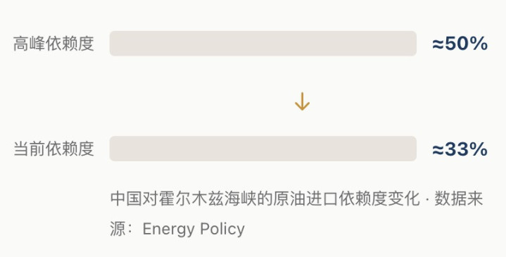 中国对霍尔木兹海峡的原油入口依赖度还是降到了约33%。从岑岭期的接近一半降到三分之一,背后是三件事同期起作用。