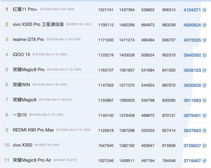 荣耀Magic8 Pro Air定位小屏轻浮旗舰,可是在性能上并莫得调和,搭载最新的天玑9500旗舰芯片,顶配版为16GB+1TB。在1月份的安兔兔旗舰性能榜中,凭借371.8万+的平均收获,荣耀Magic8 Pro Air排在榜单第11名,击败了好多标准尺寸的高端旗舰机型。该机仅有6.1毫米和155克,约略作念到这么的性能开释,还是挺让东谈主惊艳的。