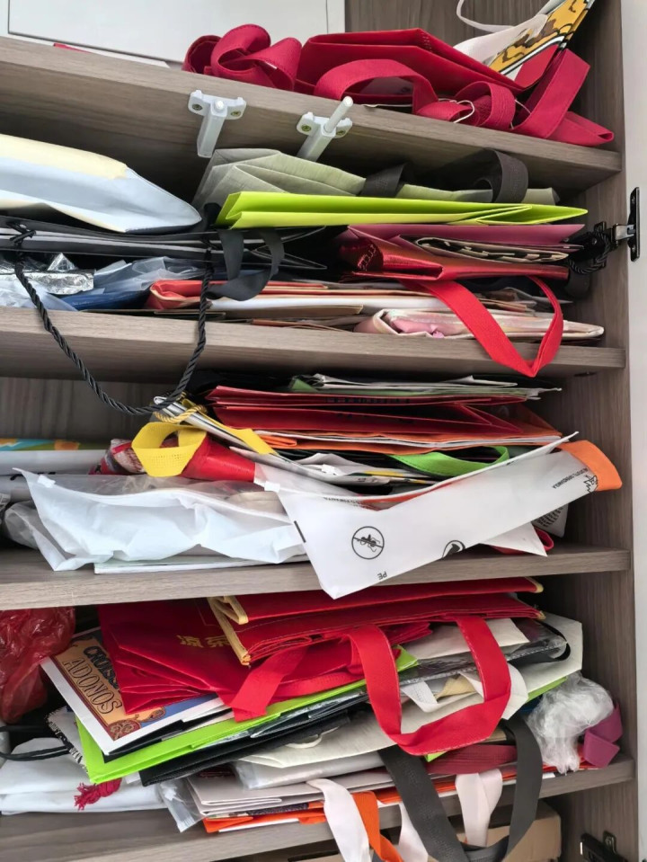 塑料袋、纸袋、外卖袋、购物袋,攒了一大堆,塞满一通盘这个词柜子,每次开门就掉出来一堆。
