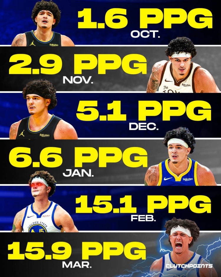 开云体育官方网站 盖·桑托斯每月场均得分握续高潮!从10月的1.6分到三月15.9分!