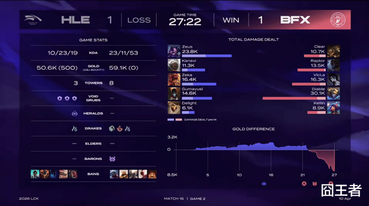 第二局比赛,BFX蓝色方,禁用:韦鲁斯、梦魇、冰鸟、娜好意思、泰坦,摄取:Clear掘墓、Raptor皇子、VicLa瑞兹、Diable艾希、Kellin芮尔;HLE红色方,禁用:卡尔玛、兰博、潘森、巴德、伊泽瑞尔,摄取:Zeus杰斯、Kanavi赵信、Zeka发条、Gumayusi炸弹东谈主、Delight派克