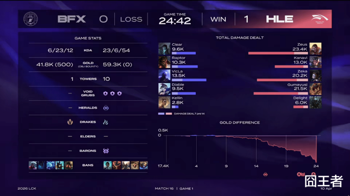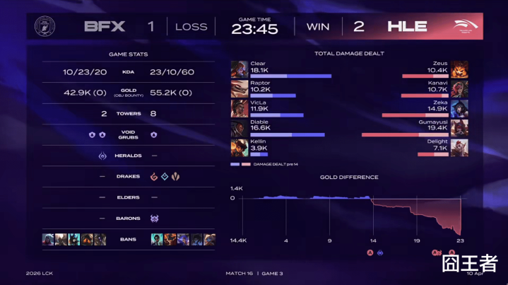 效果第一局比赛,很容易的就被HLE打成了速通局。比赛第15分钟,两队执政区爆发激战,HLE先后打出1换4后取得前期上风;比赛第16分钟,HLE一波打出0换3,而后HLE冉冉拉开经济差;比赛第19分钟,HLE持掉VicLa瑞兹后拉开八千经济差;比赛第22分钟,HLE一波打出1换5团灭BFX;最终比赛第24分42秒,HLE团灭BFX,一波截至比赛。