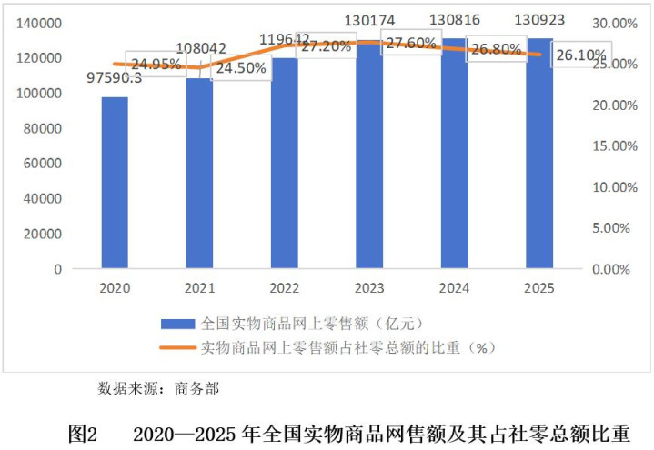 从寰球网上什物商品交往额过甚占社零总数的比重来看,2025年寰球什物商品网上零卖额达到130,923亿元,与2024年的130,816亿元比较增长较少。同期,其什物商品网上零卖额占社会破钞品零卖总数的比重为26.1%,较2024年的26.8%着落了0.7个百分点,这是该比重自2022年达到阶段性高点后贯穿第二年回落。这两项症结目的共同指向一个论断:什物商品收集零卖的渗入率已迫临刻下模式下的阶段性天花板,增长动能权贵减轻。这也从侧面印证了行业增长的主要驱能源,正从传统的什物商品网购,加快转向在线工作破钞、即时零卖以及跨境电商等新兴领域。