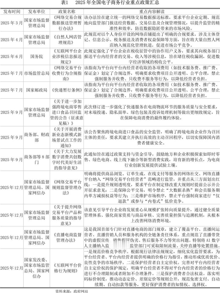 从体系框架看,2025年我国电子商务行业政策呈现监管全面深化与系统化的权贵特征。监管部门沿着电商行为的无缺链条,从策划主体、交往步履到复古门径,进行了密集的、致密化的轨制补强与升级。一方面,政策效率于将各类策划主体全面纳入范例化轨说念,举例通过《当然东说念主网店照管范例》明确个东说念主网店包袱,并通过《互联网平台企业涉税信息报送司法》强化税收协同监管。另一方面,政策对症结业态和具体市集步履实行了穿透式监管,很是是出台了《直播电商监督照管办法》和《收集交往平台司法监督照管办法》,前者建立了直播营销的全链条包袱体系,后者则将应酬、直播等新式平台明确纳入监管范围,并重心范例了平台司法制定、大数据杀熟、强制仅退款等凸起问题。同期,《收集交往平台收费步履合规指南》和《互联网平台价钱步履司法》等政策,进一步从收费公正、价钱步履等维度轨则了合规畛域,符号着针对平台经济的监管已从过后查处转向预先事中的全地点司法治理。