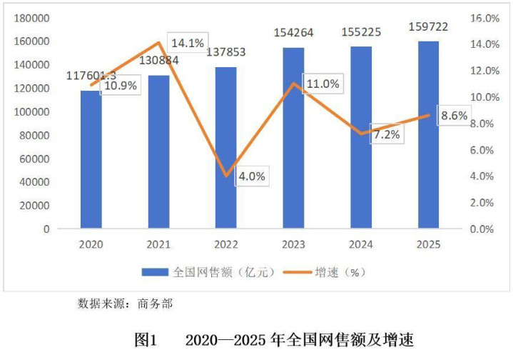 2025年全年,我国寰球网售额达到159722亿元,同比增长8.6%。这一增速较2024年的7.2%有所回升,但低于2023年11.0%的较高水平。数据夸耀,在资历了前几年的波动后,电商行业增速已进入一个相对沉稳的通说念。2025年的增长是在卓越15万亿元的巨大畛域基数上已毕的,其竣工增量也曾可不雅,这反馈出中国收集破钞市集内灵活能也曾稳重,但增长模式已从早期的高速延伸,转向更为进修和可抓续的中高速高质地发展阶段。