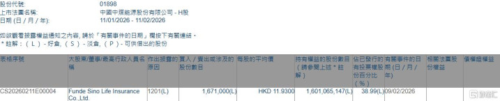 格隆汇2月11日丨笔据联交所最新职权败露贵府流露,2026年2月9日,中煤动力(01898.HK)遭FundeSinoLifeInsuranceCo.,Ltd.在场内以每股均价11.93港元减抓167.1万股kaiyun sports,涉资约1993.5万港元。