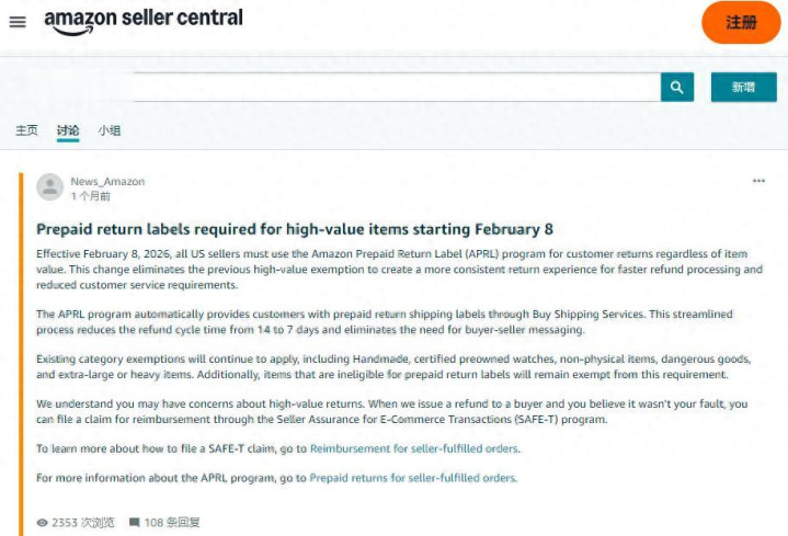 亚马逊好意思国站近日发布进击公告:自2026年2月8日起kaiyun sports,通盘自配送卖家必须长入使用“亚马逊预支退货标签商量”,取消高价值商品豁免策略,仅手工成品、认证二手手表等5类商品例外。