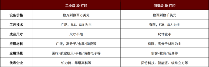 图表2:工业级3D打印与铺张级3D打印对比