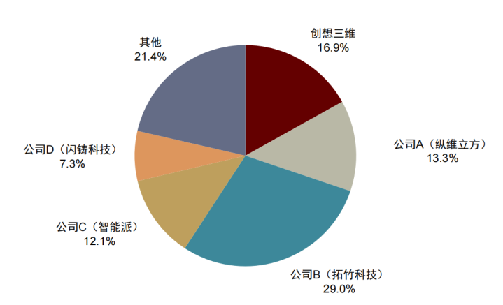 铺张级3D打印的竞争款式怎么?2024年环球出货量CR5达到78.6%,中国品牌主导环球市集,拓竹科技份额跳跃(2024年出货量份额29.0%)。铺张级3D打印机产物形态尚未熟谙,品牌款式仍在变动之中,但头部品牌竞争上风也在不休自由。