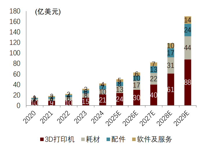 从销售额看,据灼识斟酌数据,2020~2024年环球铺张级3D打印机GMV由10亿好意思元增长至21亿好意思元,CAGR为20.4%;瞻望2029年将达88亿好意思元,2024~2029年CAGR为33.2%。