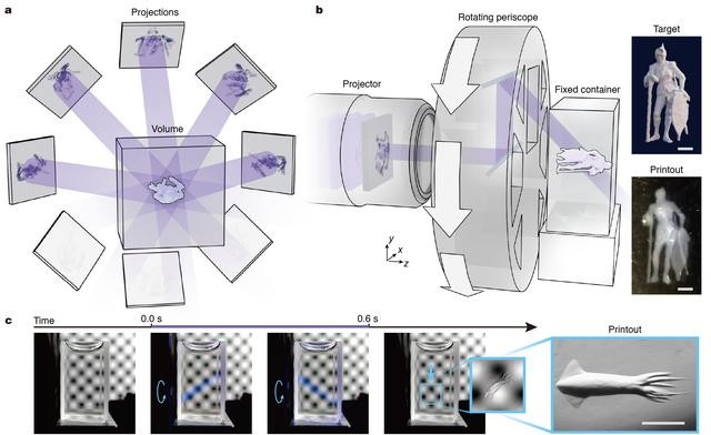 通过高速旋转的潜望镜,四面八方的光打在光敏材料上,经过光固化响应,1秒内即可“打印”毫米尺寸物体……近日,经过5年攻关,中国工程院院士戴琼海考验辅导的清华大学成像与智能本领践诺室团队研发出计较全息光场3D打印本领,生成毫米尺寸复杂结构的曝光时刻仅需0.6秒,较传统体积3D打印曝光速率普及数十倍。北京时刻2月12日,有关征询效果以“基于全息光局势成的亚秒级体积三维打印”为题,发表在国外学术期刊《当然》。