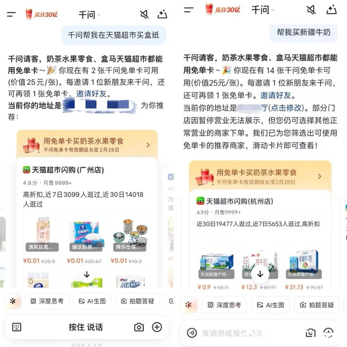 2月7日,天猫超市成为首个隐痛寰宇的AI超市,用户只需对千问APP说一句“帮我在天猫超市买洗衣液”、“帮我在天猫超市买箱纸巾”,千问就不错从天猫超市的海量商品中挑出相宜的商品,在用户下单后即时配送。据了解,千问春节「免单卡」步履不竭到2月28日,春节假期,天猫超市不仅能一句话送到家,还能享受25元免单优惠。