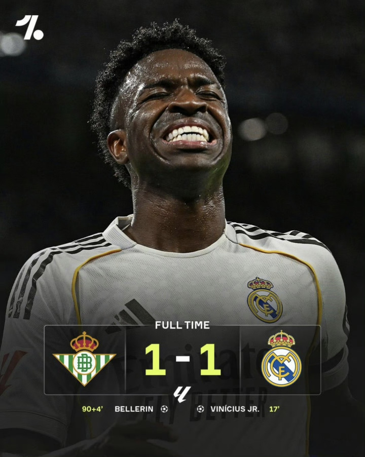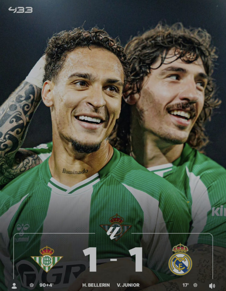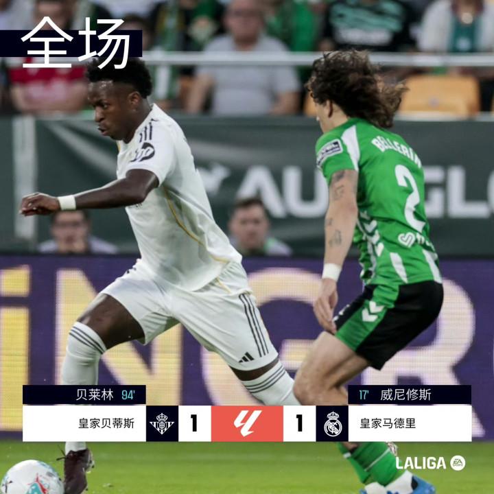 ·读秒绝平:皇马1-1贝蒂斯,先赛过期榜首8分,贝莱林读秒绝平,维尼修斯补射立功