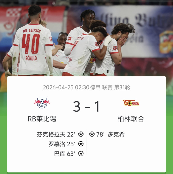北京时候4月25日02:00,德甲第31轮首场比赛,RB莱比锡主场对阵柏林谄谀。第22分钟,先下一城,芬克格拉夫外围凯旋抽射破门,莱比锡1-0。第25分钟,再下一城,罗慕洛前插将球挑过门将推射破门,莱比锡2-0。第63分钟,扬-迪奥曼德助攻巴库推射破门,莱比锡3-0。第78分钟,扳回一城,多克希抢点头球破门,柏林谄谀1-3。最终比分RB莱比锡 3-1 柏林谄谀。RB莱比锡斩获联赛5连胜,柏林谄谀则碰到联赛3连败及5轮不堪。