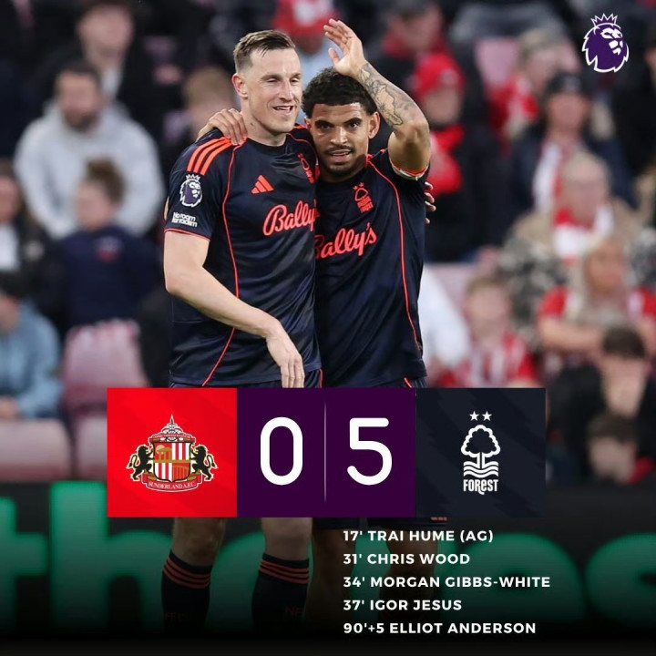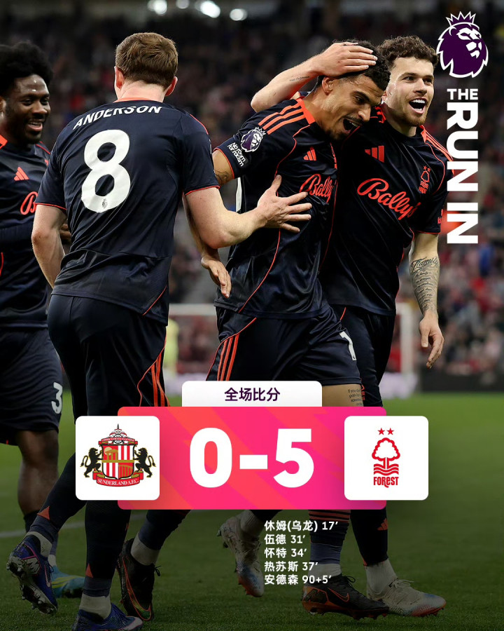 ①英超第34轮:掀开杀戒-诺丁汉丛林5-0狂胜桑德兰,伍德、怀特、热苏斯破门