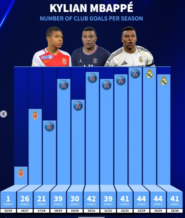 姆巴佩生计各赛季进球数:近6年均至少39球