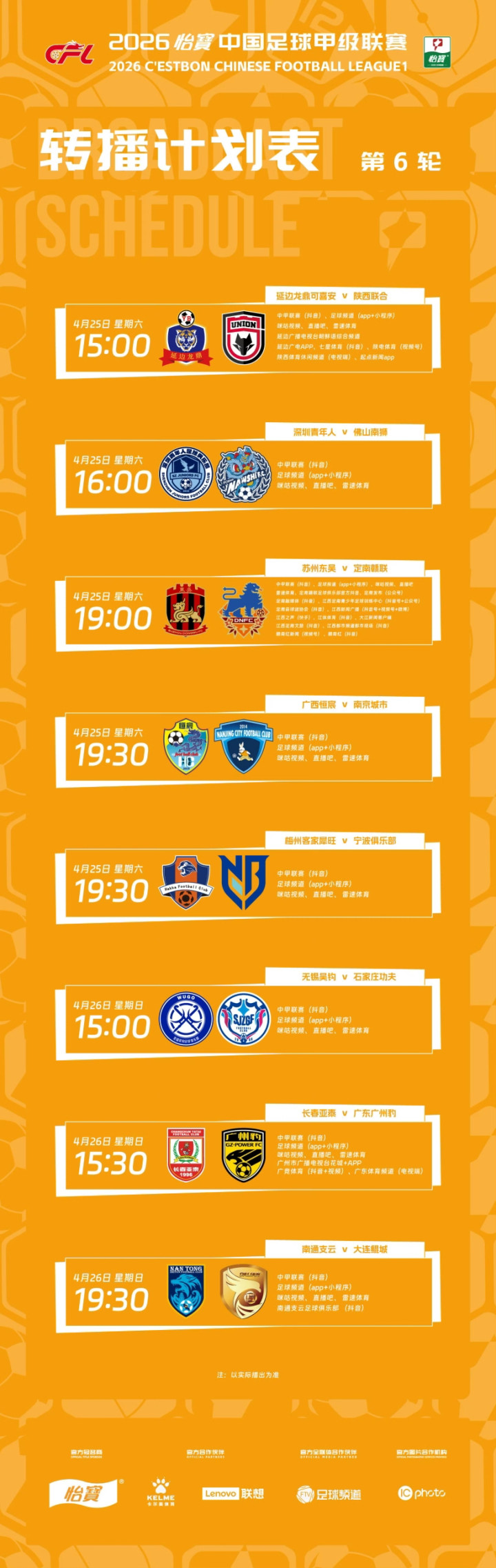 ②中甲第6轮对阵及转播策画: