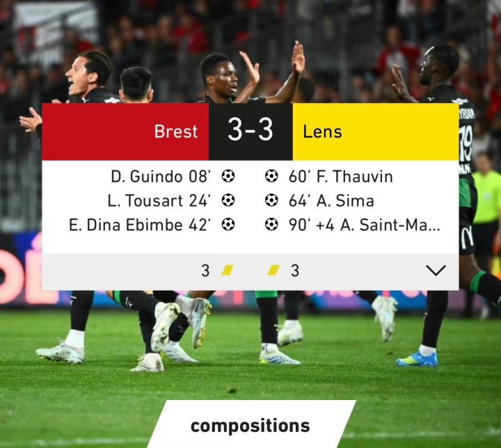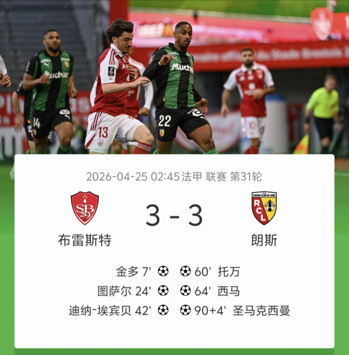 北京时候4月25日02:45,法甲第31轮揭幕战,布雷斯特主场对阵朗斯。第7分钟,金多禁区外远射寰宇波破门,布雷斯特1-0朗斯。第24分钟,图萨尔禁区头球破门,布雷斯特2-0朗斯。第42分钟,埃宾贝禁区中路低射破门,布雷斯特3-0朗斯。第60分钟,托万前场断球抽射破门,朗斯1-3布雷斯特。第64分钟,西马禁区抢刺破门,朗斯2-3布雷斯特。第90+4分钟,圣马克西曼禁区外过东谈主兜射破门,朗斯3-3绝平布雷斯特。最终比鉴别雷斯特 3-3 朗斯。布雷斯特两连平及5轮不堪,朗斯流畅4个客场失分——战绩为2平2负,争冠场面辞让乐不雅。