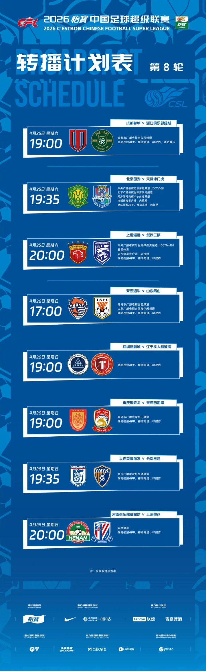 ①中超第8轮对阵及转播策画: