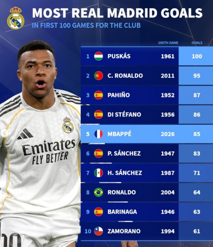 德转列皇马百场进球榜:普斯卡什100球、C罗95球 姆巴佩85球列第5