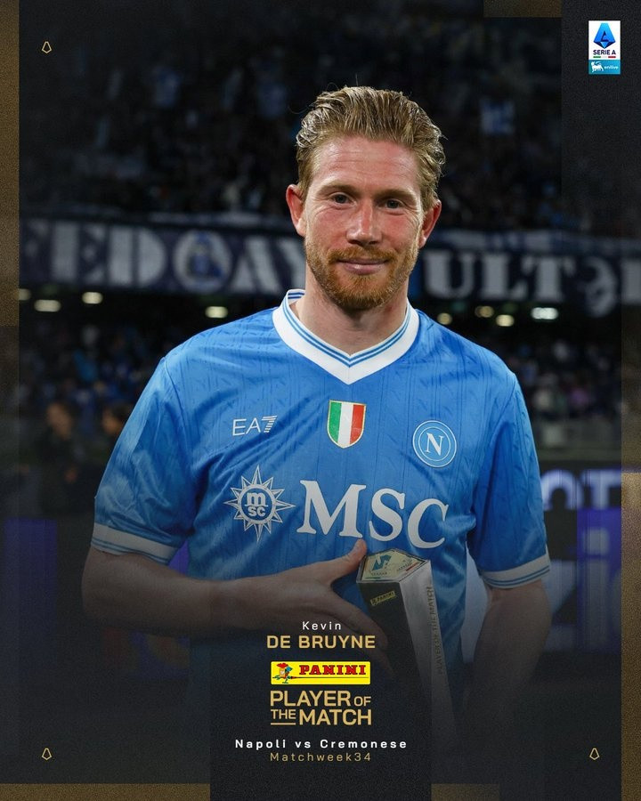传射立功!德布劳内当选那不勒斯4-0克雷莫内塞的全场最好球员