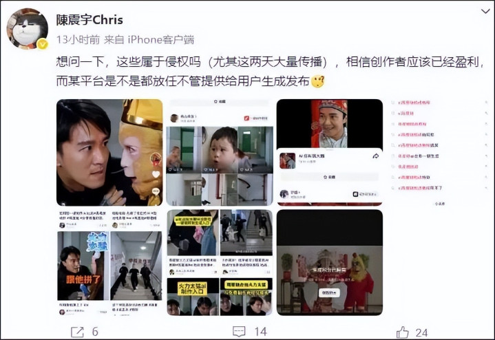 这赶快激发了周星驰团队的存眷。周星驰牙东谈主陈震宇公成立文质疑:“念念问一下,这些属于侵权吗?折服创作家应该依然盈利,而某平台是不是齐放任不论,提供给用户生成发布?”