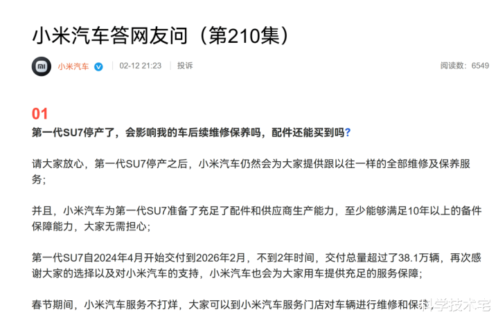 跟着小米SU7的停产,不幼年米车主惦记后期的维修配件问题。小米官方给出了回复,初代小米SU7停产之后,小米官方依旧提供跟以往相似的沿路维修和调节业绩;至于维修所需要的备件,小米官方晓谕会知足10年以上的备件保险才能。
