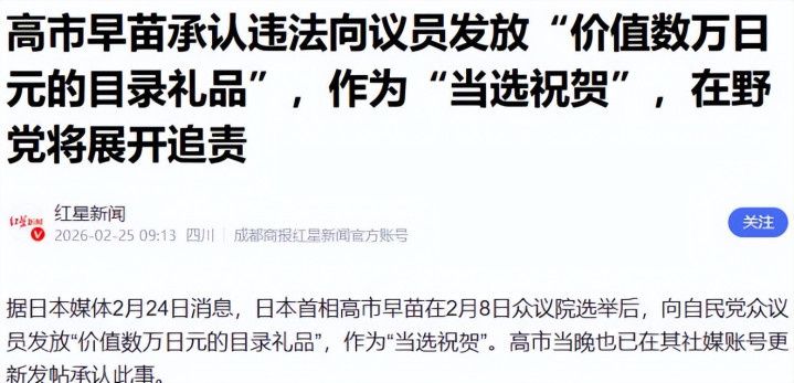 高市早苗本念念把这件事作念得荫藏一些,靠着这些小恩小惠拉拢议员,闲逸我方在自民党内的地位,可纸终究包不住火。2月24日,这起立正事件被媒体曝光,音尘一出,霎时在日本政坛掀翻山地风云。面对威望汹汹的质疑和公论压力,高市早苗知说念瞒不住了,当晚就在我方的社交账号上发文,干脆利落地承认了立正的事实,莫得涓滴辩解,号称“光速认罪”。
