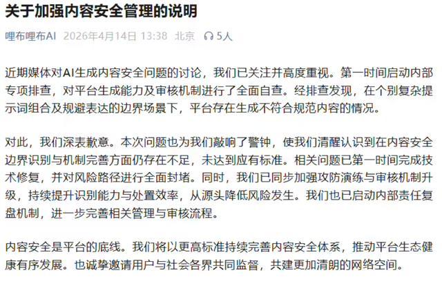 官方默示,针对近期热议的AI生成履行安全问题,自身高度心疼独立即开展专项自查,经查发当今部分复杂领导词及回避抒发的界限场景中,存在违法履行生成的问题,对此咱们深表歉意。
