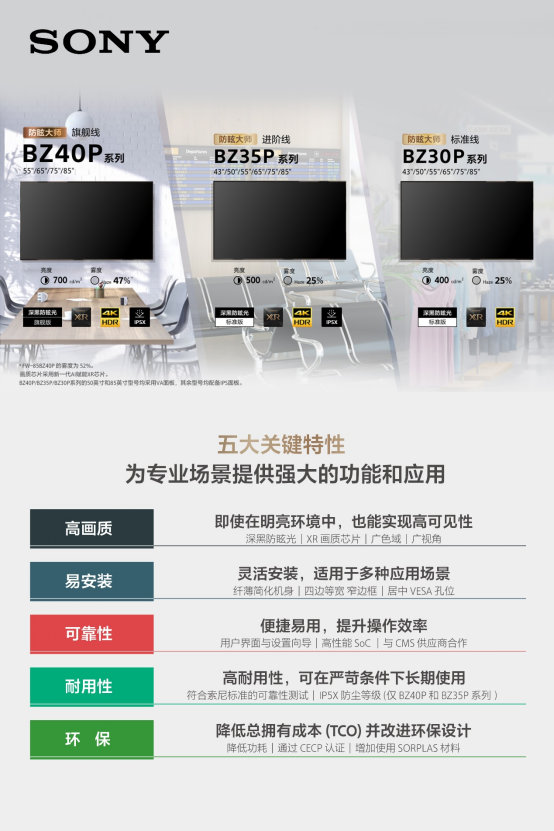 旗舰线BZ40P 定位于高端商用环境,适用于广电制播、大型企业指点中心、高端零卖橱窗等对画质与可靠性要求严苛的场景。进阶线BZ35P 则在核心地能与资本之间取得均衡,适配中型会议室、教师录播教室、宏构门店等运用。表率线BZ30P 的推出秀气着 索尼商显居品线初次系统性地将防眩技能下放到中端商用市集,面向中小企业会议室、连锁零卖门店、群众信息发布等过去的运用领域。